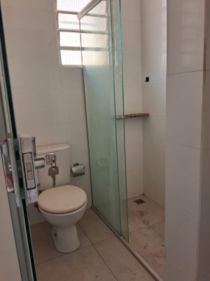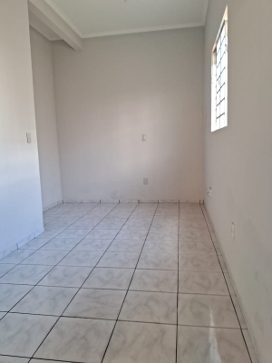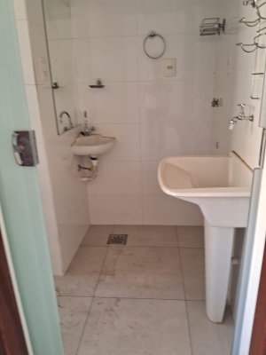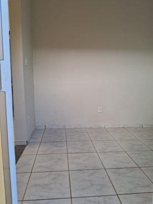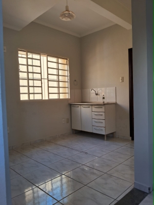 1 quarto, sala, cozinha com gabinete, banheiro social e área de serviço integrada, sem garagem.